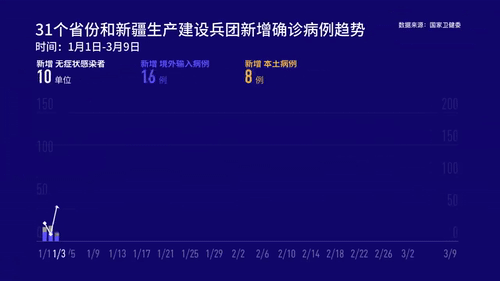 3月9日0—24时,31个省(自治区、直辖市)和新疆生产建设兵团报告新增确诊病例5例,均为境外输入病例(上海2例,河南1例,广东1例,陕西1例);无新增死亡病例;新增疑似病例3例,均为境外输入病例(均在上海)。